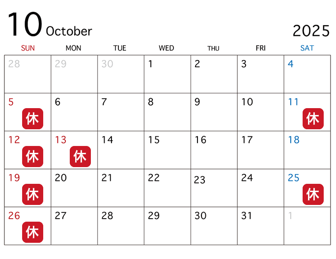 2025年10月の休業日につきましては、下記のカレンダーをご参照下さい。